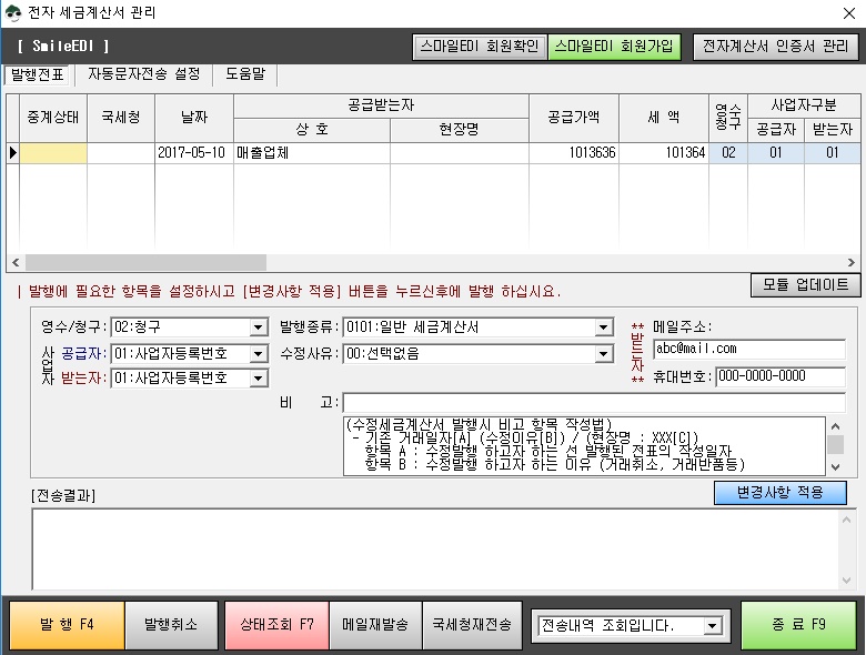 4. 회원 확인이 되면 영수/청구,공급자.공급받는자,발행종류,메일주소 등을 확인하고 이상이 없으면