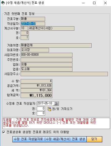 표기된 내용과 작성일자, 권/호가 맞는지 확인하고 수정 전표 작성일자로 [수정 세금/계산서] 전표 생성 버튼을 클릭합니다.