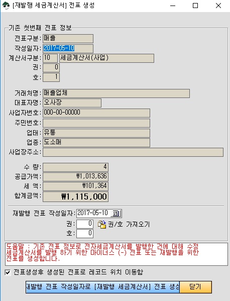3. 재발행 세금계산서 전표 생성 : 재발행하는 세금계산서 전표를 선택하고 이 메뉴를 선택하면 재발행 하는 세금계산서 전표를 생성하는 화면이 나옵니다.