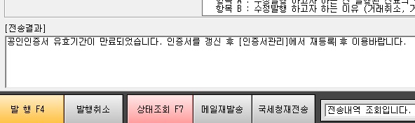 전자계산서 발행시 위 이미지처럼 오류나는 경우는 발행할려는 컴퓨터에 인증서가 없거나 인증서 유효기간이 만료된 경우에 나오는 메세지입니다.