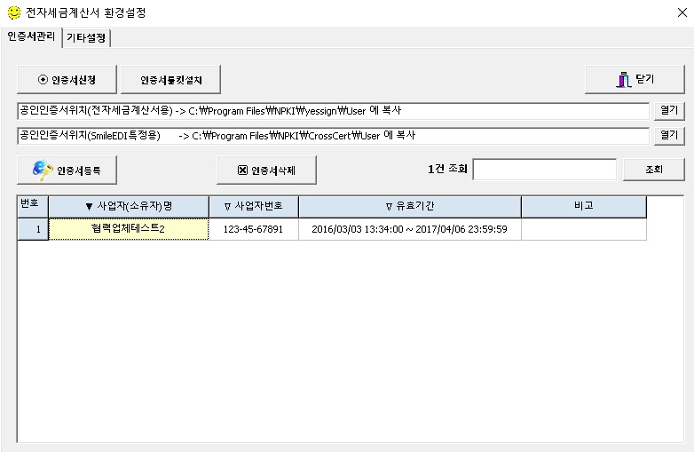 인증서는 인터넷뱅킹이나 한국전자인증 또는 스마일EDI에서 받을수 있으며, 사업자 범용 인증서 또는 전자계산서 발행용 인증서를 받으면 됩니다.