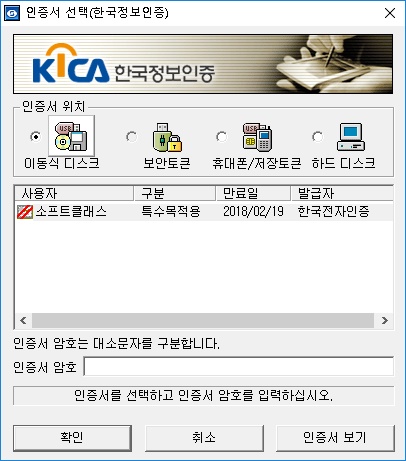 7-3. 인증서 선택화면이 나오면 인증서가 저장된 매체를 선택해서 인증서를 선택한 다음 인증서 암호를 입력하고 확인을 클릭합니다.