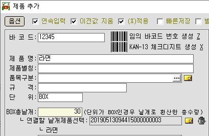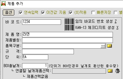 바코드 제품명 단위 BOX당 낱개 연결할 낱개 제품선택