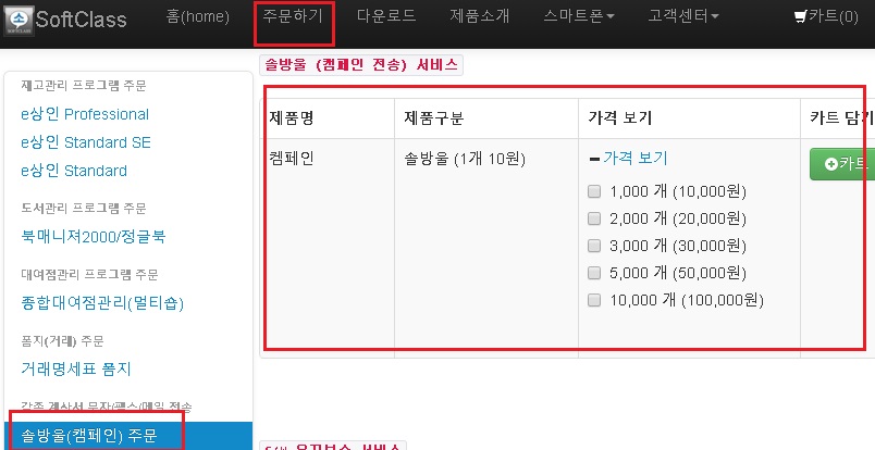 4. 홈페이지가 뜨면 회원로그인후 주문하기에서 캠페인(솔방울) 서비스를 선택해 포인트를 구매합니다.
